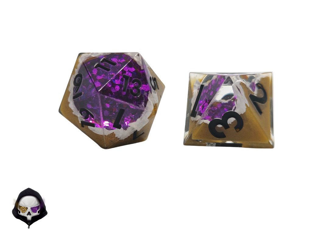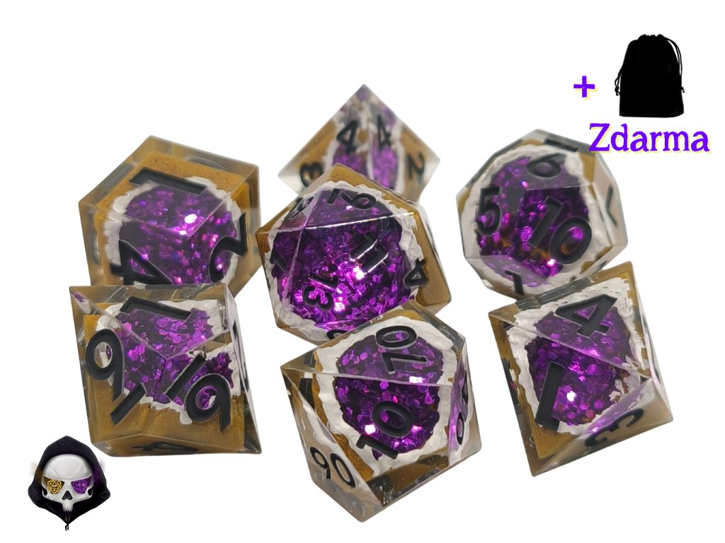 Tato unikátní sada sedmi polyhedrálních kostek (D4, D6, D8, D10, D%, D12, D20) je ručně vyráběná z pryskyřice a každá kostka je originál. Díky ostrým hranám a jedinečným prvkům přináší do vaší hry nejen funkčnost, ale i estetický zážitek. Vzhledem k ruční výrobě mohou jednotlivé kostky vykazovat drobné kosmetické vady, jako jsou bublinky nebo rýhy, což však nijak neovlivňuje jejich herní vlastnosti.