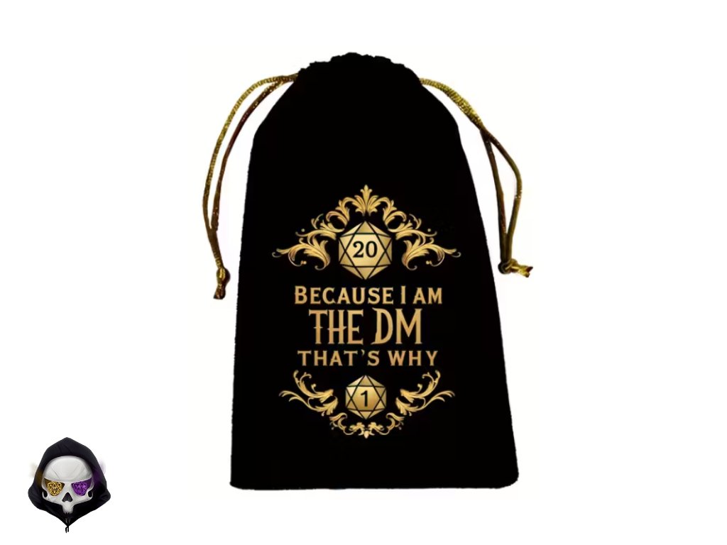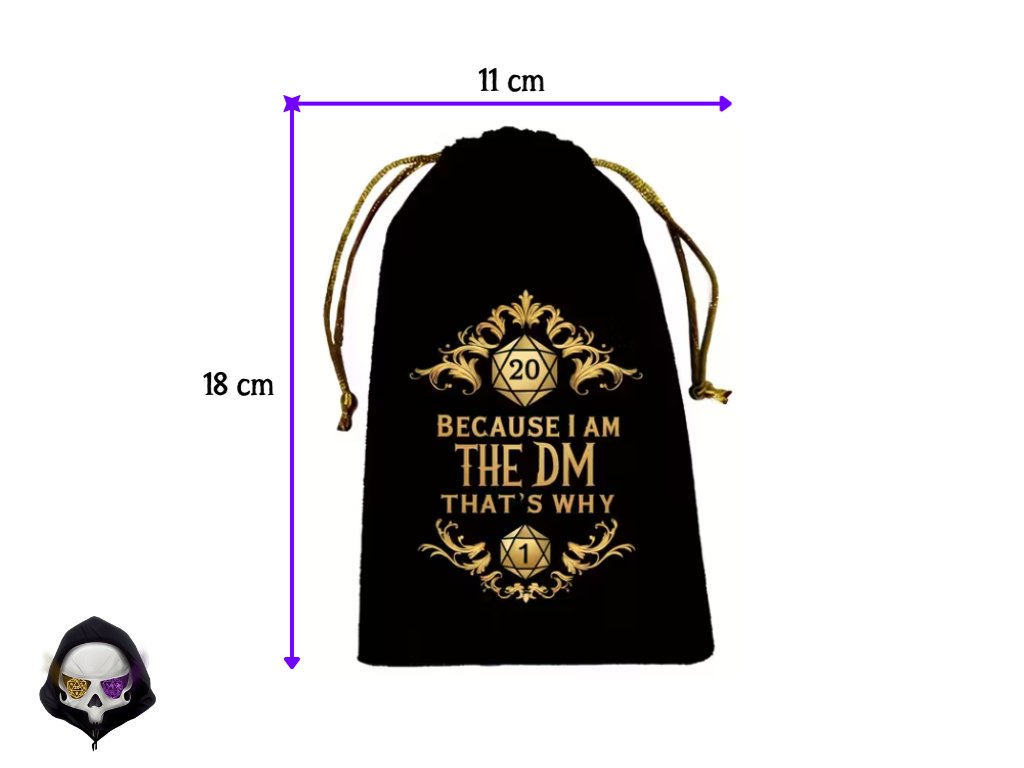Stylový černý semišový sáček na kostky s potiskem „Because i am the DM“ pro bezpečné uložení až 10 sad standardních DnD kostek. Ideální pro hráče, kteří chtějí mít své kostky vždy po ruce a v bezpečí.