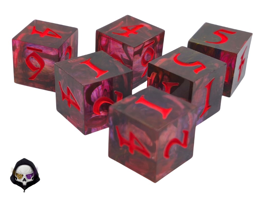 Ručně vyráběná sada šesti šestistěnných kostek (6D6). Ideální pro DnD, Dračí hlídku, Warhammer i další deskové hry.