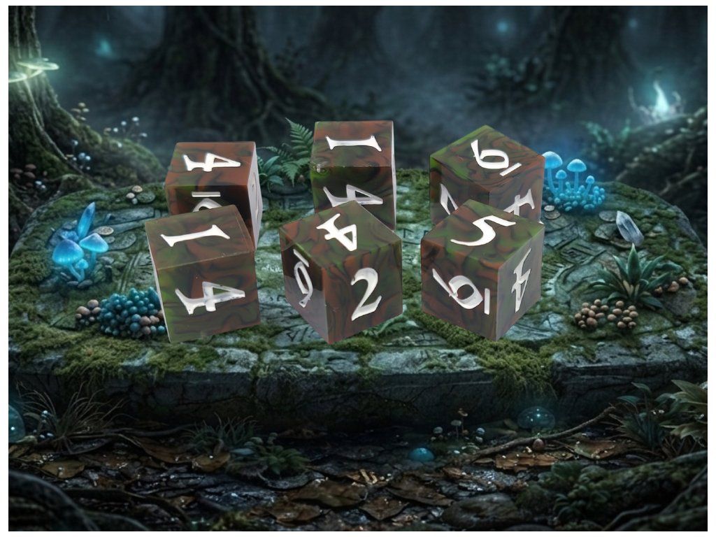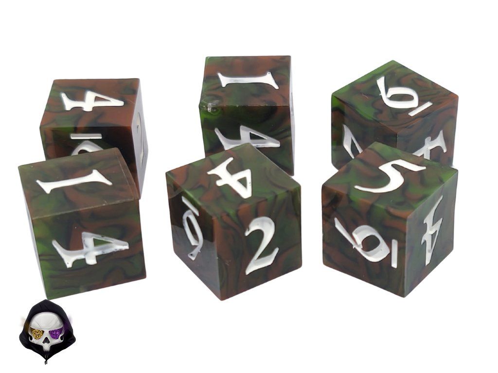 Ručně vyráběná sada šesti šestistěnných kostek (6D6). Ideální pro DnD, Dračí hlídku, Warhammer i další deskové hry.