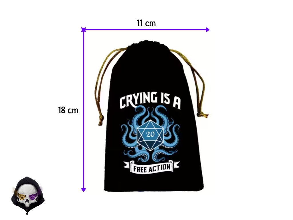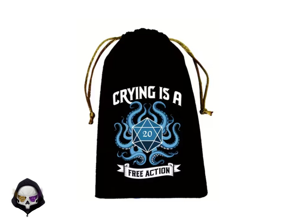 Stylový černý semišový sáček na kostky s potiskem „Crying is a Free Action“ pro bezpečné uložení až 10 sad standardních DnD kostek. Ideální pro hráče, kteří chtějí mít své kostky vždy po ruce a v bezpečí.