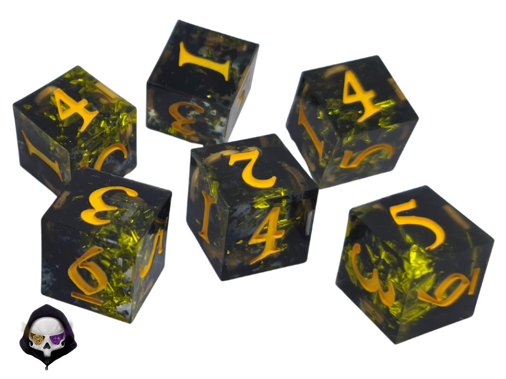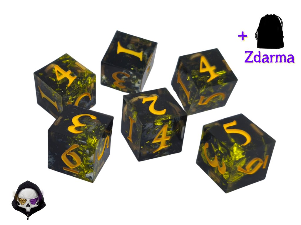 Ručně vyráběná sada šesti šestistěnných kostek (6D6). Ideální pro DnD, Dračí hlídku, Warhammer i další deskové hry.