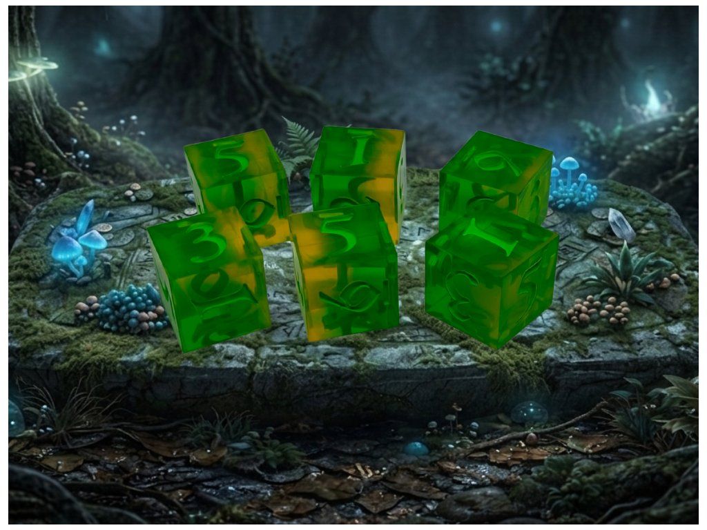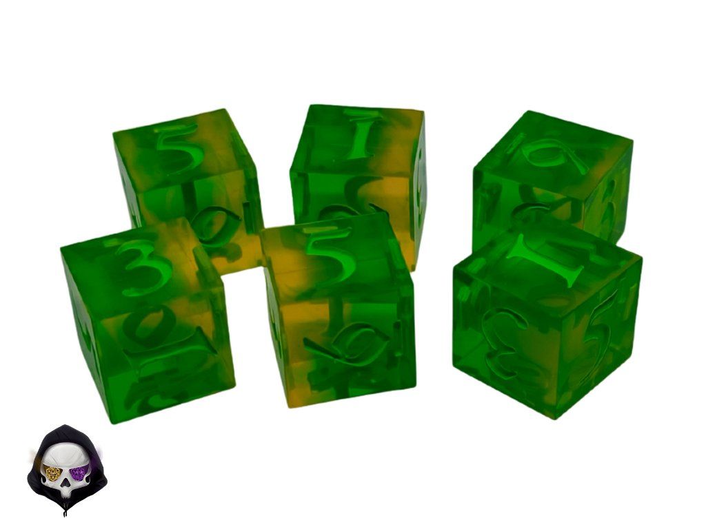 Ručně vyráběná sada šesti šestistěnných kostek (6D6). Ideální pro DnD, Dračí hlídku, Warhammer i další deskové hry.