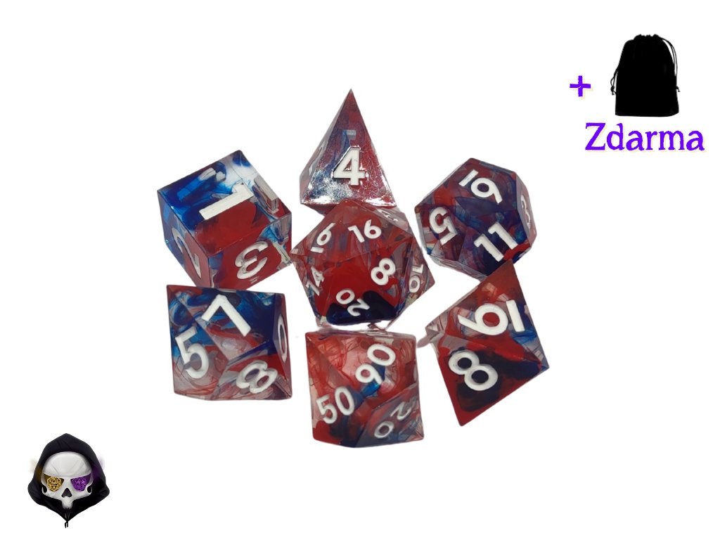 Tato unikátní sada sedmi polyhedrálních kostek (D4, D6, D8, D10, D%, D12, D20) je ručně vyráběná z pryskyřice a každá kostka je originál. Díky ostrým hranám a jedinečným prvkům přináší do vaší hry nejen funkčnost, ale i estetický zážitek. Vzhledem k ruční výrobě mohou jednotlivé kostky vykazovat drobné kosmetické vady, jako jsou bublinky nebo rýhy, což však nijak neovlivňuje jejich herní vlastnosti.