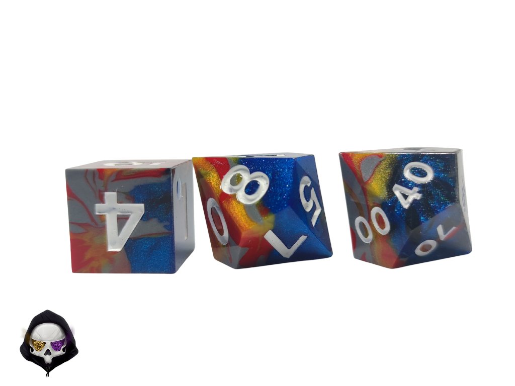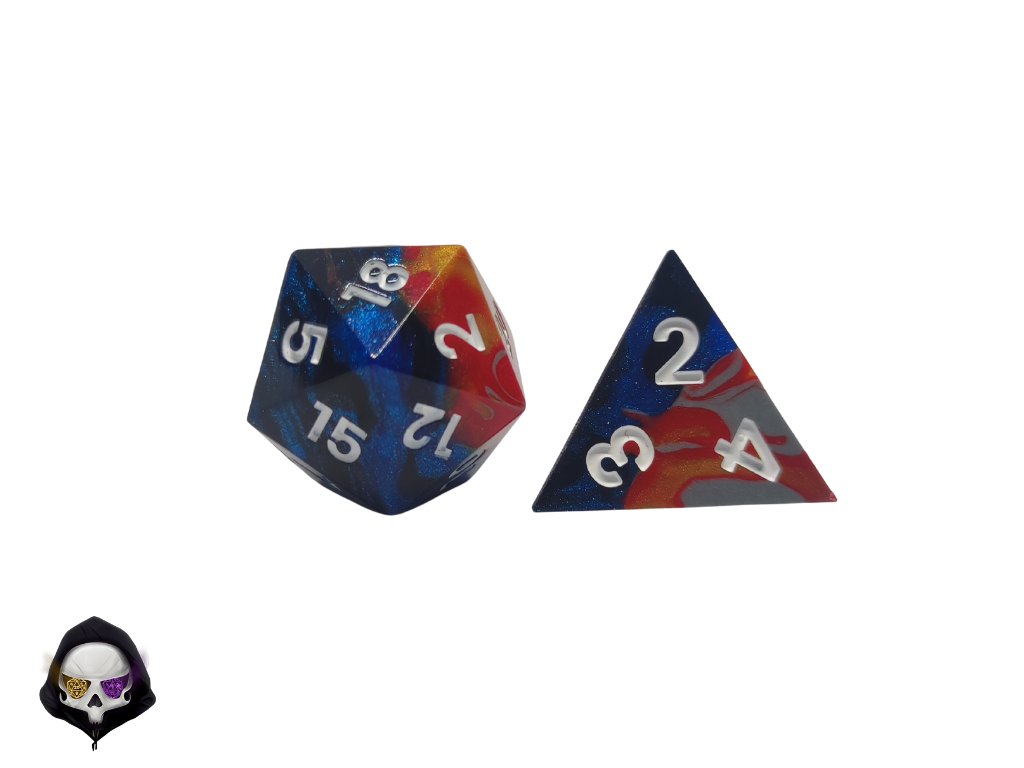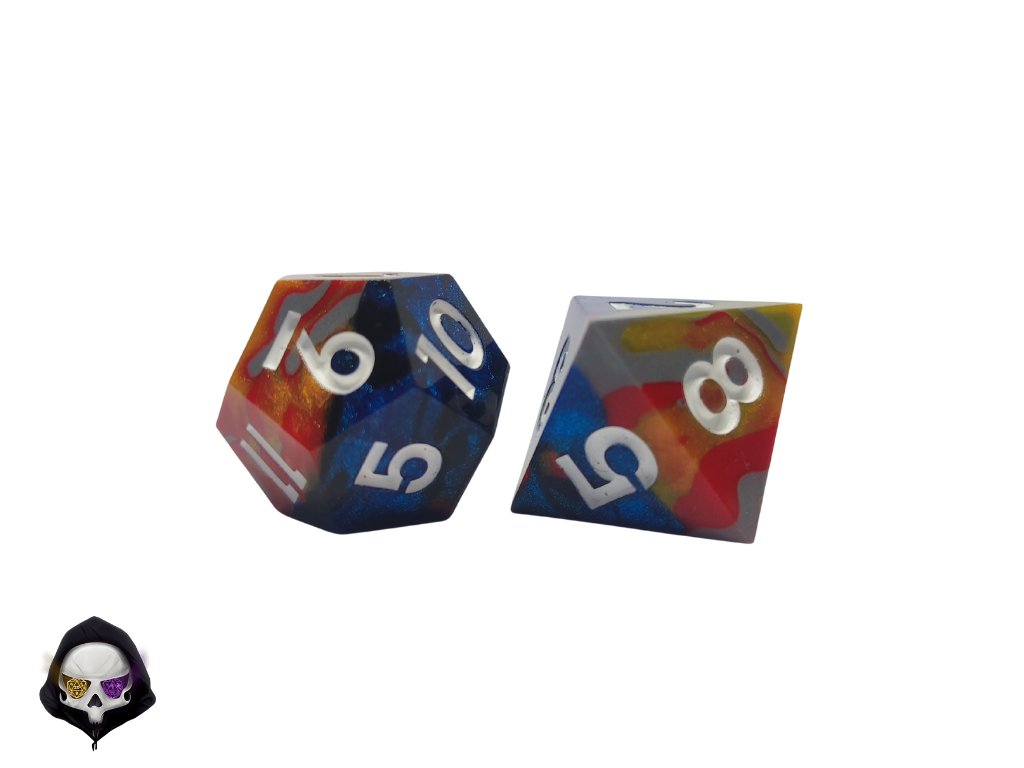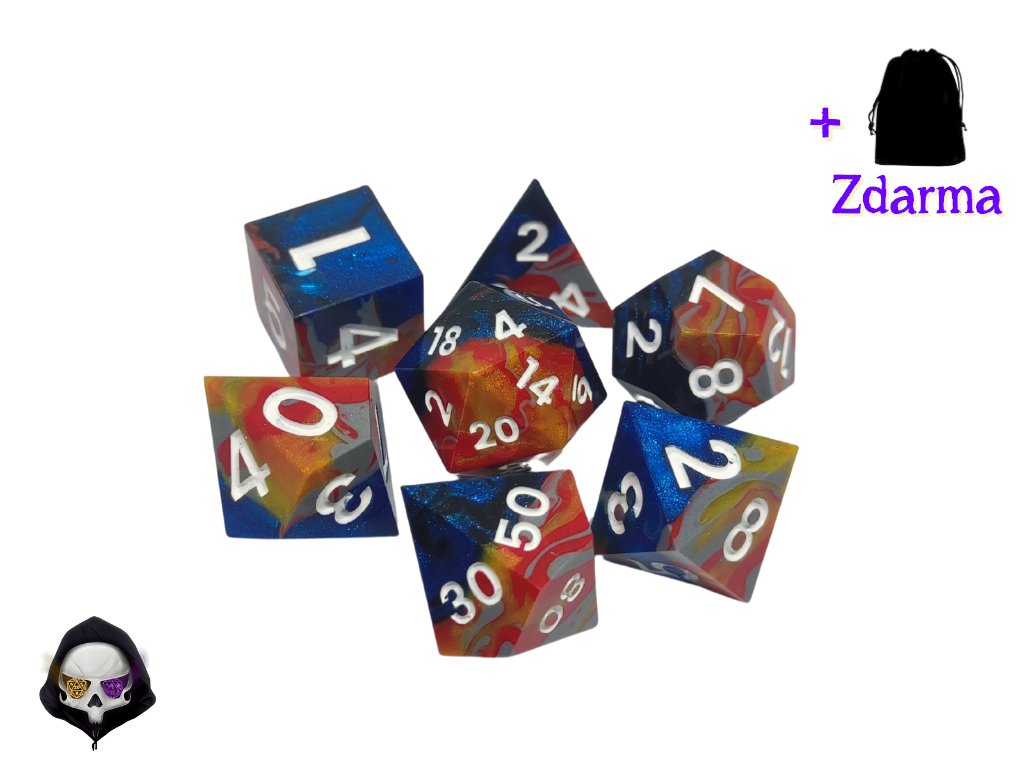 Tato unikátní sada sedmi polyhedrálních kostek (D4, D6, D8, D10, D%, D12, D20) je ručně vyráběná z pryskyřice a každá kostka je originál. Díky ostrým hranám a jedinečným prvkům přináší do vaší hry nejen funkčnost, ale i estetický zážitek. Vzhledem k ruční výrobě mohou jednotlivé kostky vykazovat drobné kosmetické vady, jako jsou bublinky nebo rýhy, což však nijak neovlivňuje jejich herní vlastnosti.