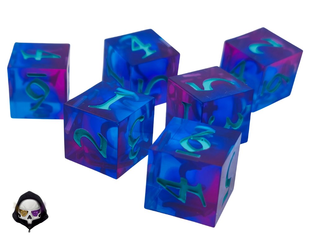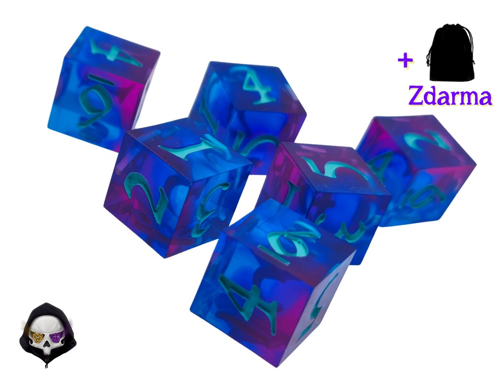 Ručně vyráběná sada šesti šestistěnných kostek (6D6). Ideální pro DnD, Dračí hlídku, Warhammer i další deskové hry.