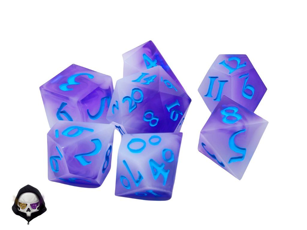 Tato unikátní sada sedmi polyhedrálních kostek (D4, D6, D8, D10, D%, D12, D20) je ručně vyráběná z pryskyřice a každá kostka je originál. Díky ostrým hranám a jedinečným prvkům přináší do vaší hry nejen funkčnost, ale i estetický zážitek. Vzhledem k ruční výrobě mohou jednotlivé kostky vykazovat drobné kosmetické vady, jako jsou bublinky nebo rýhy, což však nijak neovlivňuje jejich herní vlastnosti.