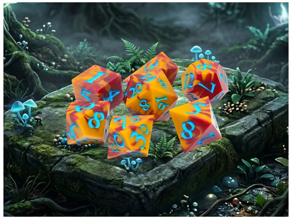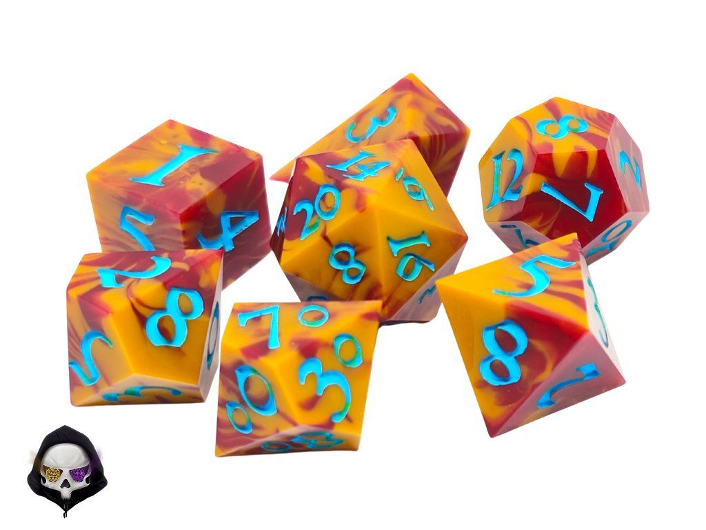 Tato unikátní sada sedmi polyhedrálních kostek (D4, D6, D8, D10, D%, D12, D20) je ručně vyráběná z pryskyřice a každá kostka je originál. Díky ostrým hranám a jedinečným prvkům přináší do vaší hry nejen funkčnost, ale i estetický zážitek. Vzhledem k ruční výrobě mohou jednotlivé kostky vykazovat drobné kosmetické vady, jako jsou bublinky nebo rýhy, což však nijak neovlivňuje jejich herní vlastnosti.