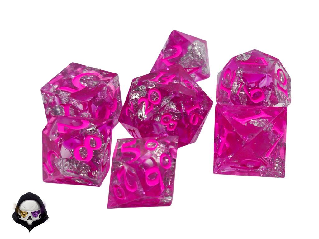 Tato unikátní sada sedmi polyhedrálních kostek (D4, D6, D8, D10, D%, D12, D20) je ručně vyráběná z pryskyřice a každá kostka je originál. Díky ostrým hranám a jedinečným prvkům přináší do vaší hry nejen funkčnost, ale i estetický zážitek. Vzhledem k ruční výrobě mohou jednotlivé kostky vykazovat drobné kosmetické vady, jako jsou bublinky nebo rýhy, což však nijak neovlivňuje jejich herní vlastnosti.