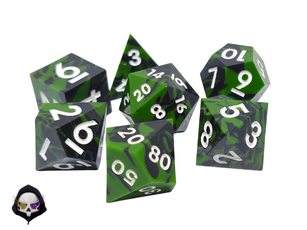 Tato unikátní sada sedmi polyhedrálních kostek (D4, D6, D8, D10, D%, D12, D20) je ručně vyráběná z pryskyřice a každá kostka je originál. Díky ostrým hranám a jedinečným prvkům přináší do vaší hry nejen funkčnost, ale i estetický zážitek. Vzhledem k ruční výrobě mohou jednotlivé kostky vykazovat drobné kosmetické vady, jako jsou bublinky nebo rýhy, což však nijak neovlivňuje jejich herní vlastnosti.