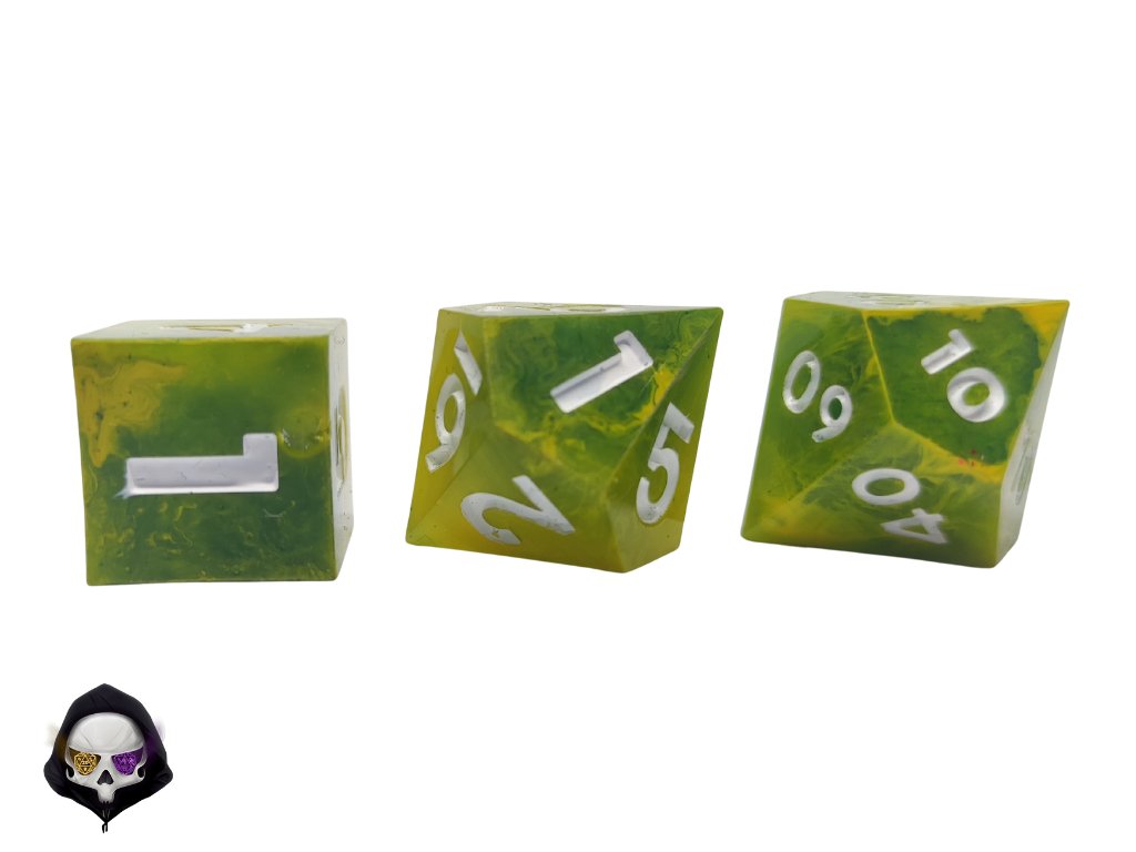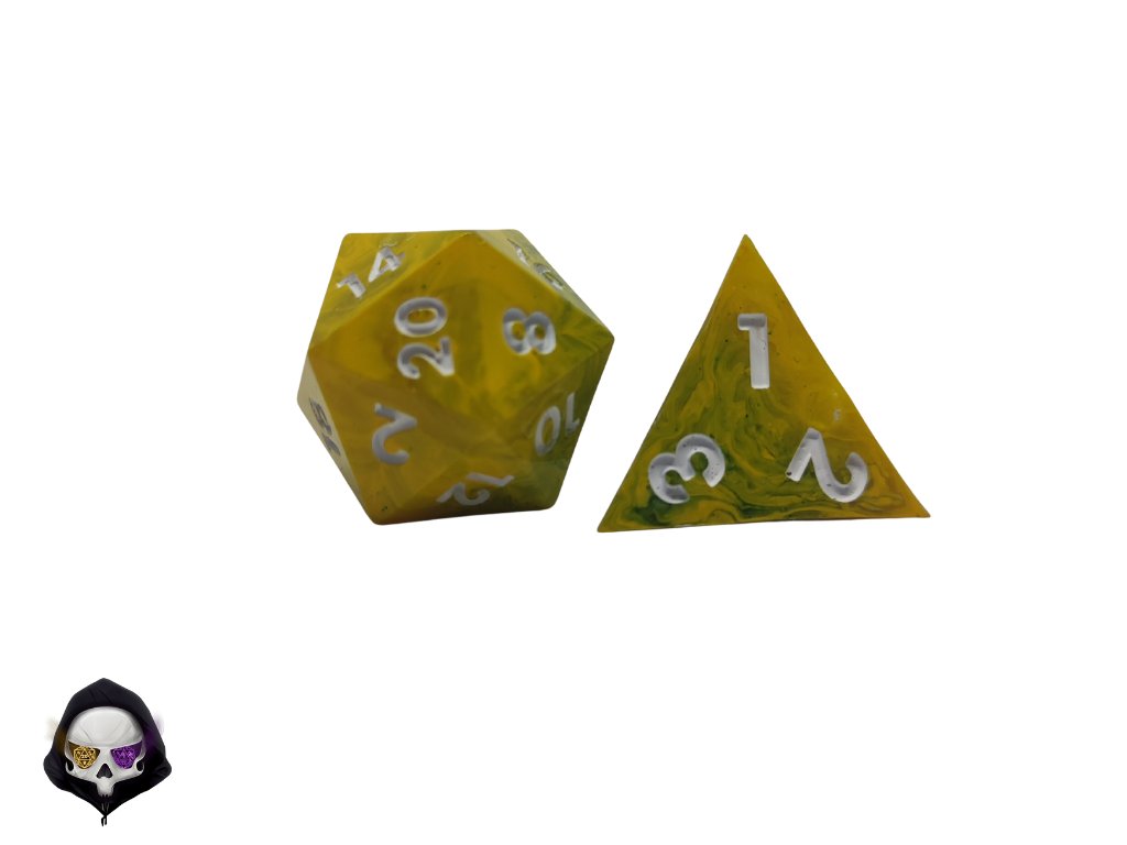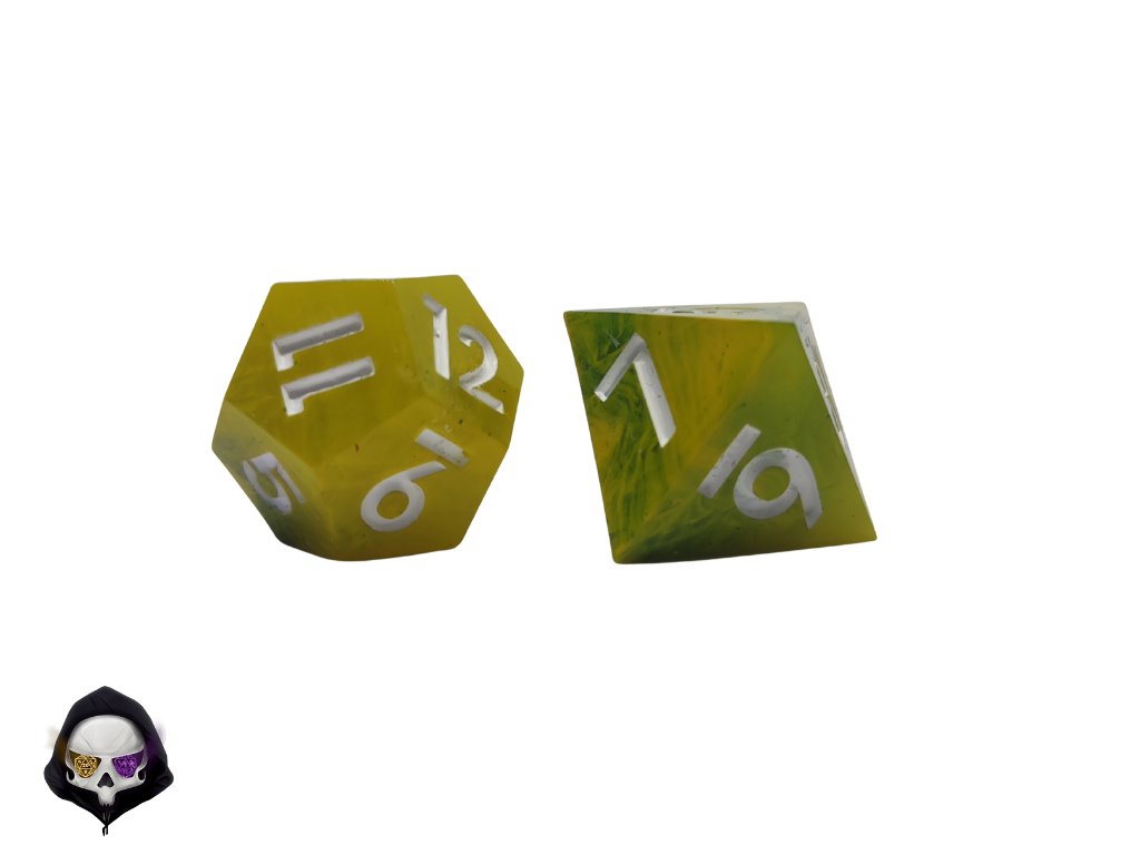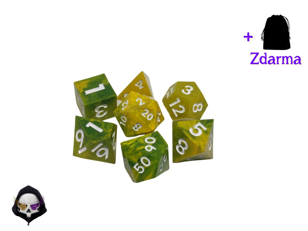 Tato unikátní sada sedmi polyhedrálních kostek (D4, D6, D8, D10, D%, D12, D20) je ručně vyráběná z pryskyřice a každá kostka je originál. Díky ostrým hranám a jedinečným prvkům přináší do vaší hry nejen funkčnost, ale i estetický zážitek. Vzhledem k ruční výrobě mohou jednotlivé kostky vykazovat drobné kosmetické vady, jako jsou bublinky nebo rýhy, což však nijak neovlivňuje jejich herní vlastnosti.