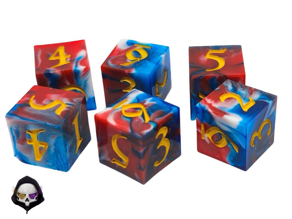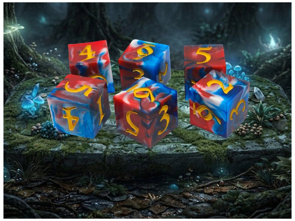 Ručně vyráběná sada šesti šestistěnných kostek (6D6). Ideální pro DnD, Dračí hlídku, Warhammer i další deskové hry.