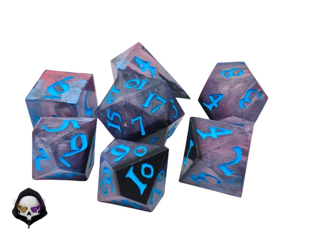 Tato unikátní sada sedmi polyhedrálních kostek (D4, D6, D8, D10, D%, D12, D20) je ručně vyráběná z pryskyřice a každá kostka je originál. Díky ostrým hranám a jedinečným prvkům přináší do vaší hry nejen funkčnost, ale i estetický zážitek. Vzhledem k ruční výrobě mohou jednotlivé kostky vykazovat drobné kosmetické vady, jako jsou bublinky nebo rýhy, což však nijak neovlivňuje jejich herní vlastnosti.